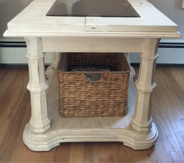 When I inherited it from her, I painted over her forest green & yellow sponge paint with white. I decided to give it an aged look by using a dark stain...